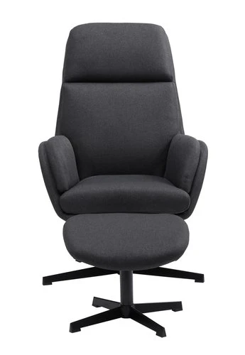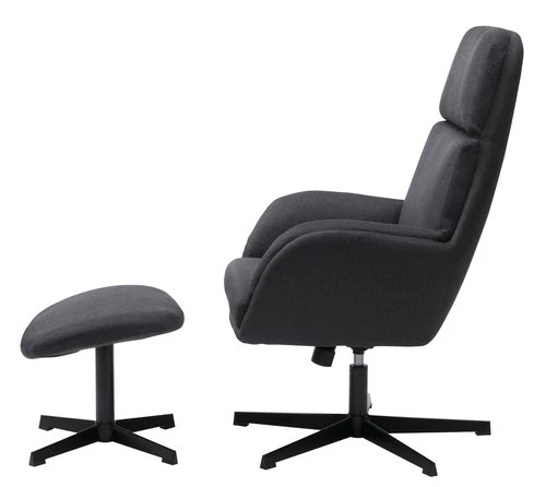 En contreplaqué, acier. Garnissage : mousse polyuréthane. Revêtement : polyuréthane. Base pivotante : acier. Inclinable. Incl. repose-pieds. l70 x H107 x P77 cm