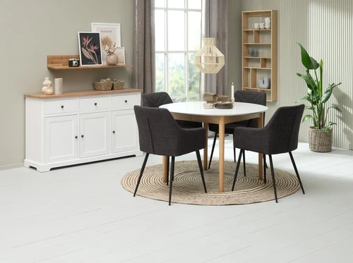 Table : partie supérieure : MDF mélaminé, acier. Cadre, pieds : bois de caoutchouc massif. Vernis. Incl. 2 rallonges (dimensions avec rallonges : l110 x L200 x H75 cm). Ø110 x H75 cm. Chaise : contreplaqué. Garnissage : mousse polyester (24-28 kg/m³). Revêtement : polyester. Pieds : acier. l59 x H84 x P58 cm