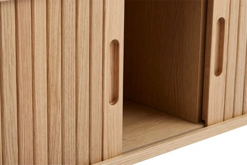Chêne massif, placage chêne et placage décoratif. Avec portes coulissantes tambours. l120 x H50 x P40 cm