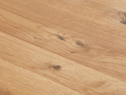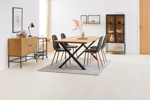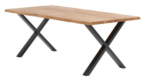 En chêne massif. Piètement : acier. Huilé. Excl. rallonges. l95 x L200 x H75 cm