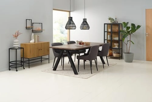 En MDF placage chêne, panneau de particules. Pieds : bouleau massif, pin massif. Excl. rallonges. Vernis, teinté. l100 x L210 x H75 cm