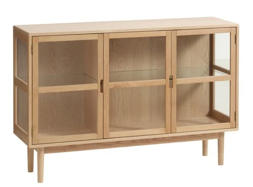 Face avant, côtés : chêne massif, verre trempé. Partie supérieure : panneau de particules, placage chêne. Pieds : chêne massif. 2 étagères en verre. 3 portes. l120 x H80 x P35 cm
