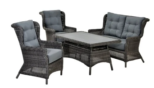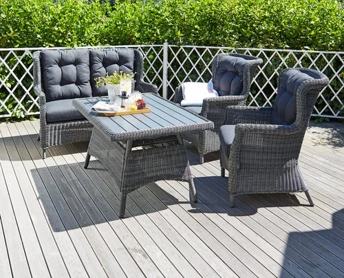 Cadre : aluminium, polyrotin (polyéthylène). Plateau : DURAWOOD® bois composite (polypropylène/fibre de bois). Le DURAWOOD® est un matériau composite durable constitué à partir de fibres de bois dur FSC® et de plastique. l81 x L124 x H64 cm
