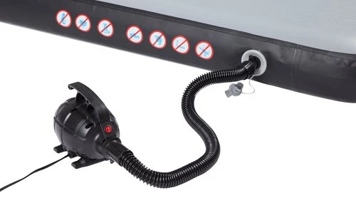 | Caractéristiques | Pompe électrique, Construction intérieure avec 16 000 fils stabilisateursUne construction intérieure de 16 000 fils relie les surfaces supérieure et inférieure du tapis de gymnastique. Cela permet d'augmenter la stabilité, d'obtenir une surface plane et d'améliorer le décollage., Valve à fermeture automatiqueUne vanne à fermeture automatique possède un mécanisme qui permet à l'air comprimé de circuler dans un sens et l'empêche de circuler dans l'autre., Couverture à double couche qui conserve sa formeLe revêtement à double épaisseur rend les côtés du tapis de gymnastique plus épais et donc plus durables. Cela permet au tapis de gymnastique de conserver sa forme et de prolonger sa durée de vie., Deux ou plusieurs tapis de gymnastique peuvent être assemblésLe bande auto-agrippant permet de relier deux ou plusieurs tapis de gymnastique pour obtenir une plus grande surface de saut. |